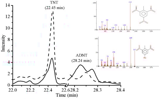 GC-MS analysis of TNT metabolite following degradation. The figure shows peaks of TNT before degradation (short dashes); after 9 h incubation by E-MO (solid lines).