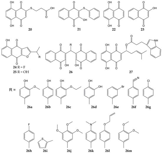 In another research, 3,3′-(arylmethylene)bis(2-hydroxy-1,4-naphthoquinone) analogs (26a–m) were synthesized from 23 and substituted aromatic aldehydes. These dimeric derivatives were evaluated with in vitro assays against two NA (C. perfringens and influenza A H5N1 virus). All molecules inhibited bacterial NA (percentages of inhibition ranging from 70.9 to 96.6%). Then, the ten analogs with percentages of inhibition >80% were assessed in viral NA inhibition assay; molecules 26a and 26b exhibited the lowest IC50 values (29 and 26.5 µM, respectively). Further, the docking simulation evidenced that compound 26b interacts with amino acids of binding pocket from the NA of influenza A(H5N1) virus through H-bonds with Arg118, Arg371, Tyr406, Glu277, Asp151, and Arg152, as well as hydrophobic interactions with Tyr347 [111].