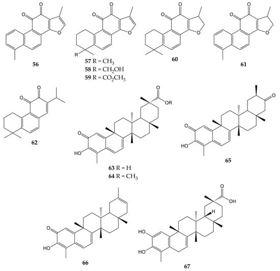 Other quinone-type derivatives have been demonstrated to inhibit the activity of the above-mentioned viral targets of SARS-CoV. For example, tanshinone I (56), tanshinone IIA (57), tanshinone IIB (58), methyl tanshinonate (59), cryptotanshinone (60), dihydrotanshinone I (61), and rosmariquinone (62) exerted an inhibitory effect over 3CLpro in a dose-dependent manner (except for 60), with IC50 values of 38.7, 89.1, 24.8, 21.1, 226.7, 14.4, and 21.1 µM, respectively. These tanshinones (diterpene quinolones) were previously isolated from the roots of Salvia miltiorrhiza (an Asian medicinal plant belonging to the Laminaceae family and employed to treat coronary heart disease) and also inhibited the activity of PLpro from SARS-CoV in a time-dependent manner. These natural products evidenced potent inhibition after 60 min of preincubation (IC50 of 8.8 for 56, 1.6 for 57, 10.7 for 58, 9.2 for 59, 0.8 for 60, 4.9 for 61, and 30.0 µM for 62) [130].