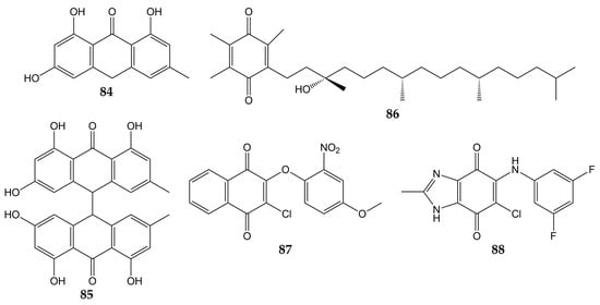 Due to the global health emergency derived from the current pandemic, various studies have focused on the search for compounds with activity against the novel SARS-CoV-2 and its molecular targets. Among the molecules evaluated are quinones, and the chemical structures of these compounds (quinones 68–83) are shown in Figure 8.