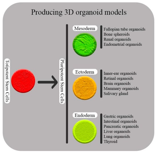 The zygote cell and its initial divisions (embryonic cells), which are considered totipotent stem cells, have the capacity to give rise to fully developed living organisms (body and placenta). Pluripotent stem cells, which can generate all cells that make up a live organism’s body following totipotent stem cells, are the next stage (mesoderm, endoderm, and ectoderm). Organoids are the new era for disease modeling, homeostasis, and development studies. Organoids derived from mesoderm, endoderm, and ectoderm are considered a new field of interest in biomedical research.