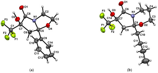 The stereo configuration of tetrahydropyrrolo[2,1-b][1,3]oxazol-5-one 4 and tetrahydro-2H-pyrrolo[2,1-b][1,3]oxazine-6-one 8 was additionally confirmed by XRD analysis, which was performed for bicycles 4dc (Figure 3a) and 8cc (Figure 3b). It was found that these bicycles have the cis-arrangement of the OH-group in the pyrrole and the oxygen atom in the adjacent oxazacycle (Figure 3).