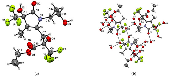 (a) The ORTEP view of compounds 11b according to XRD data; (b) crystal packing of 11b with indication of intermolecular hydrogen bonds.