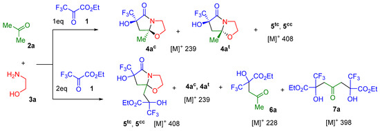 Three-component reaction of ethyl trifluoropyruvate 1, acetone 2a and aminoethanol 3a.