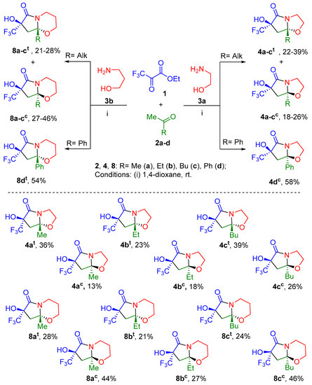 Furthermore, we carried out three-component equimolar reactions of ethyl trifluoropyruvate 1 with methyl ketone 2a–d and 2-aminoethanol 3a or 3-amino-1-propanol 3b in 1,4-dioxane at room temperature. In this case, the introduction of aminopropanol 3b in the reaction expands the scope of these three-component transformations, allowing the synthesis of oxazine derivatives. Variation of the methyl ketone component, which used not only acetone 2a, but also 2-butanone 2b, 2-hexanone 2c, and acetophenone 2d, makes it possible to change the substituent at the nodal carbon atom of the resulting bicycles. It was found that in reactions with alkyl methyl ketones 2a–c in each case, a mixture of cis- and trans-diastereomers of pyrrolo[2,1-b][1,3]oxazol-5-ones 4a–c or pyrrolo[2,1-b][1,3]oxazin-6-ones 8a–c is formed (Scheme 2). Notably, there is one more regularity: trans-diastereomers were prevailed in the formation of oxazole derivatives 4, while cis-isomers were prevailed in the formation of oxazine bicycles 8.