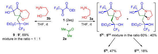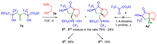 Further, reactions of a twofold excess of pyruvate 1 with acetone 2a and amino alcohols 3a,b in THF at room temperature were studied. The reaction of pyruvate 1 with acetone 2a and aminoethanol 3a leads to the formation of pyrrolo[2,1-b][1,3]oxazolone 5 functionalized with a 2-trifluoromethyl-2-hydroxypropanoate fragment (which can be called a heterocyclic aldol) as a mixture of two trans,cis- and cis,cis-diastereomers in a ratio of 60%:40% (Scheme 3), which we managed to separate. Diastereomer 5tc precipitated during the reaction, and diastereomer 5cc was isolated from the reaction mixture by column chromatography. However, the yields of pure products are low, since fractions with an unseparated mixture of isomers remain.