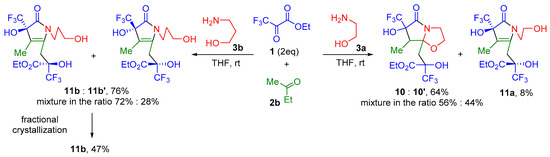 It is obvious that amino alcohols 3a,b react as mononucleophiles during the formation of pyrrolidinones 11a,b. Previously, we showed that amino alcohols 3a,b in three-component reactions of polyfluoroalkyl-3-oxo esters with methyl ketones 2 or cycloketones can behave both as mono- and di-nucleophiles [32,37].