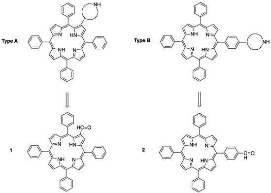 These amine–porphyrin hybrids were prepared through a mixed-porphyrin synthesis [29] from pyrrole, benzaldehyde, and a suitable N-Boc-protected amino aldehyde, in which, after oxidation with p-chloranil, a careful chromatographic purification is necessary to obtain the desired mono-functionalized porphyrins from the statistical porphyrin mixture in low yields (4–15%). In order to overcome this drawback, we decided to investigate the synthesis of two new types of amine–porphyrin hybrids derived from 5,10,15,20-tetraphenylporphyrin (TPPH2), in which the cyclic secondary amine moiety is linked either to a β-pyrrolic position (Type A) or to the p-position of one of the meso phenyl groups (Type B). As depicted in Figure 2, these two types of amine-functionalized porphyrins could be accessed from the known 2-formyl-5,10,15,20-tetraphenylporphyrin 1 [30] and from 5-(4-formylphenyl)-10,15,20-triphenylporphyrin 2, [31] through condensation or reductive amination reactions with the suitable amines, taking advantage of the synthetic versatility of the formyl group.