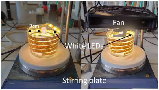 Experimental setting for the photocatalytic reactions. LED coil (white light, 18 W, 1080 lumens), stirring plate. Left: Without fan. Right: With fan.