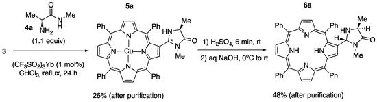 We reasoned that this failure could be due to the complexation of Yb(III) by the porphyrin core. In order to test this hypothesis, we submitted the Cu(II) complex 3 to the same reaction conditions. We were pleased to find that after 24 h, a 26% yield of the metalated imidazolidinone 5a was obtained upon chromatographic purification on silica gel. A dichloromethane solution of 5a was stirred for 4 min with concentrated H2SO4 (1 mL/mmol) at room temperature and poured over aqueous, concentrated NaOH at 0 °C. After extraction with chloroform, chromatographic purification afforded (with a 48% yield) the desired imidazolidinone 6a as a single diastereomer, according to 1H NMR (Scheme 2; see Figure S4 in the SM). On the precedent of the previously observed stereochemical preferences of 2-substituted imidazolidin-4-ones, [18,41] we tentatively assigned a trans relative stereochemistry to 6a.