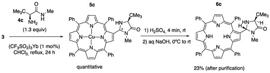 Finally, the condensation reaction between the Cu(II) 2-formylporphyrinate 3 and the tert-L-leucine-derived amide 4c (1.3 equiv) was again carried out in refluxing chloroform and YbTf3 as the catalyst. After 24 h, the crude product, obtained upon the evaporation of the solvent, was purified by column chromatography on silica gel to afford the compound 5c (apparently as a diastereomer mixture). The demetalation was carried out with concentrated H2SO4 (4 min at rt), and the subsequent neutralization was carried out with NaOH. The crude product obtained was then purified by column chromatography, affording compound 6c with an overall yield of 23% as a single diastereomer (Scheme 4; see Figure S9 in the Supplementary Materials). The relative stereochemistry of 6c could not be determined by 1H-1H NOESY or by 1H-1H ROESY NMR. However, as in the case of the compounds 6a and 6b’, taking again into account the known preference for the formation of trans-imidazolidinones, [18,41] we assigned a trans relationship between the two substituents at C2 and C5 in the imidazolidinone ring.