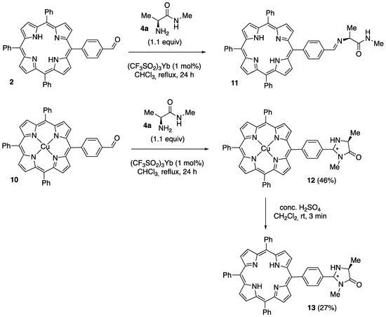 Copper(II) 5-(4-((2R/2S,4S)-1,4-dimethyl-5-oxoimidazolidin-2-yl)phenyl)-5,10,15-triphenyl porphyrinate (12). L-alanine methylamide 4a (30 mg, 0.22 mmol) was introduced to a 25 mL round-bottomed flask equipped with magnetic stirring and a Dimroth reflux condenser. Then, a solution of copper(II) 5-(4-formylphenyl)-10,15,20-triphenylporphyrinate 10 (81 mg, 0.11 mmol) in CHCl3 (6 mL) and Yb(SO3CF3)3 (0.62 mg, 1 mol%) were added sequentially. The stirred mixture was heated up to reflux for 24 h. After cooling to room temperature, the solvent was evaporated under reduced pressure and the residue was purified via flash column chromatography through Et3N-pretreated silica gel (2.5% v/v NEt3), using mixtures of DCM/MeOH (from 1% v/v to 5% v/v) as eluents. The fast-running red band, which contained unreacted starting material, was not collected. Compound 12 (40 mg, 46% yield) was obtained as a diastereomeric mixture (two spots in TLC, DCM/MeOH 0.5%) that was not further characterized.