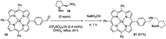 To obtain the desired bifunctional catalyst by the reductive amination of meso-tetraphenylporphyrin-carbaldehyde 2 with the primary amine 18, we started with the conditions described by Liu et al. [46] for a related transformation (MeOH/THF, NaBH4, reflux). However, we only observed the complete reduction of the aldehyde 2 to alcohol 9. The same result was obtained when we used sodium cyanoborohydride in THF, or when we heated a chloroform solution of 2 and 50 in the presence of NaBH4/YbTf3.