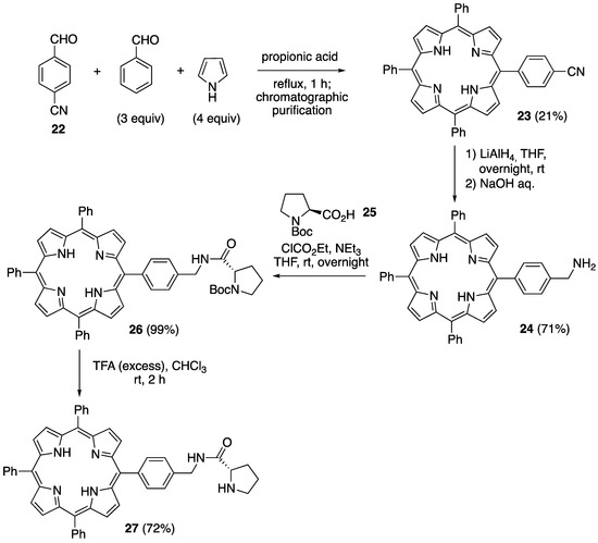 In order to obtain another example of an amine-functionalized porphyrin hybrid of Type B based on the formation of an amide bond, we decided to prepare the meso-tetraphenylporphyrin amine derivative 24, a compound that was first described by Bryden and Boyle [47]. To begin, the functionalized porphyrin 23, having a nitrile group in the 4-position of one of the phenyl groups, was obtained by the mixed condensation of p-cyanobenzaldehyde 22, benzaldehyde, and pyrrole in propionic acid under reflux. After two successive chromatographic purifications, 23 was obtained with a 21% yield (48% of the statistical yield). Next, the reduction of the cyano group was performed using lithium aluminum hydride, affording the desired porphyrin 24 with a 71% yield. Easily available N-Boc-L-proline 25 [48] was transformed to a mixed anhydride with ethyl chloroformate and triethylamine in THF at −15 °C, and a THF solution of 24 (0.83 equiv) was added dropwise. After warming to rt, the amide 26 was obtained in an almost quantitative yield following chromatographic purification. The cleavage of the N-Boc group by trifluoroacetic acid in chloroform provided the final porphyrin–amine hybrid 27 with a 72% yield (Scheme 10).