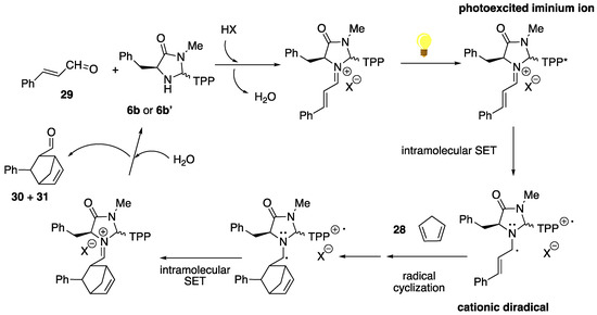 In light of these results, we finally performed the Diels–Alder cycloaddition between cyclopentadiene 28 and trans-cinnamaldehyde 29 under visible light irradiation, using the imidazolidinone–porphyrin hybrids of Type I 6b, 6b’, and 6c as bifunctional organophotocatalysts in toluene, and in the presence of p-toluenesulfonic acid as a co-catalyst.
