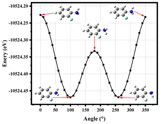 Rotating the C-N bond of o-fluoroaniline in a 10° step to scan the total molecular energy with the density functional theory (DFT) and CAM-B3LYP/6-311+G(d,p) basis set, 36 structures are generated, as shown in Figure 1. It is specified that the two hydrogen atoms of the amino group are symmetrical on both sides of the benzene ring, and the angle is 0° at this time. Intuitively, there are two lowest-energy structures located at angles of 100° and 260°; o-fluoroaniline can form a double-well structure. When the angle of 100°, the energy is −10,524.46942 eV, and the energy is −10,524.46912 eV at a 260° angle. Thus far, we can accurately determine the ground state energy and structure of o-fluoroaniline. We find that the energy of the eleventh structure is the lowest, so this structure is the ground state geometry of o-fluoroaniline, and subsequent calculations are based on this structure.