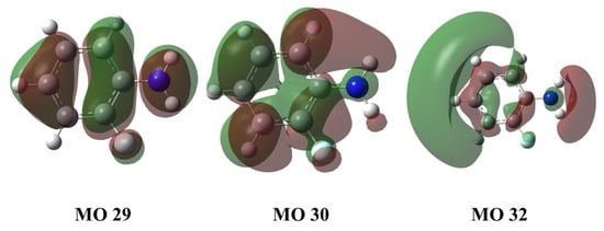 MO29, MO30, MO32 orbitals of o-fluoroaniline S1 state. Calculation method and basis set: TD-DFT and CAM-B3LYP/6-311+G(d,p).