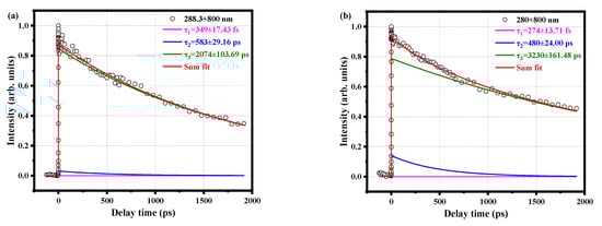 Figure 3a shows the time decay curve of the parent ion under pump pulse at 288.3 nm and probe pulse at 800 nm. This line shape can be well fitted by convolution of a Gaussian cross-correlation function and three exponential decay functions, resulting in three-time constants, τ1 = 349 ± 17.43 fs, τ2 = 583 ± 29.16 ps, and τ3 = 2074 ± 103.69 ps. It is worth noting that τ3 decay for a long time, well above the upper limit of our delay platform, and therefore cannot be measured accurately. When the pump pulse is changed to 280 nm, the time decay curves of the parent ions are obviously different, as shown in Figure 3b. The Gaussian cross-correlation function and convolution of three exponential decay functions are also used to fit the data. The time scales of the three decay components are significantly different from the data of 288.3 nm, and their lifetimes are τ1 = 274 ± 13.71 fs, τ2 = 480 ± 24.00 ps, and τ3 = 3230 ± 161.48 ps. The τ1 and τ2 components at the pump pulse of 280 nm become faster, which is also found in previous work [9]. This is attributed to the differences in internal energy and vibrational density.