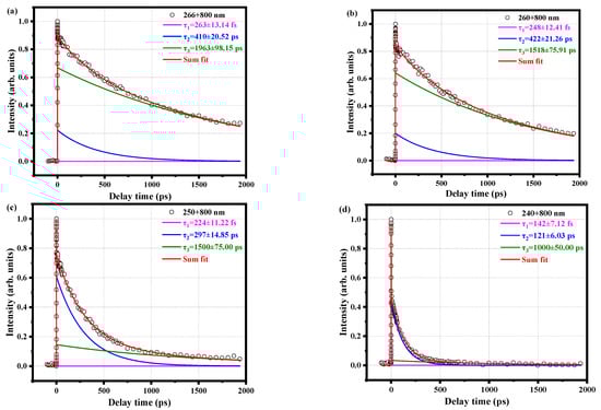 Time decay curves of the parent ion measured with (a) 266 nm pump pulse and 800 nm probe pulse, (b) 260 nm pump pulse and 800 nm probe pulse, (c) 250 nm pump pulse and 800 nm probe pulse, and (d) 240 nm pump pulse and 800 nm probe pulse. The circles are experimental data, and the solid lines are fitted data. All curves are fitted using a Gaussian cross-correlation function and a convolution of three exponential decay functions to obtain different decay times.