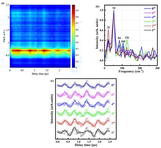 In the above, we have attributed the τ1 component to an IVR, and now we analyze this ultrafast formation in detail. We measure the photoelectron image at different time delays and extract the corresponding photoelectron energy spectrum, as shown in Figure 6a. This fig is integrated to obtain the signal intensity of the six peaks varying with delay time. After fitting with the cross-correlation function and the convolution of the three exponential decay functions (The three decay functions correspond to 349 fs, 583 ps, and 2074 ps), the decay components are subtracted to obtain the residual and the beat signals. In order to describe the beat phenomenon in detail, a fast Fourier transform (FFT) is performed on the extracted beat signal about all peaks (time domain signal is converted into frequency domain signal), as shown in Figure 6b. It is determined the frequency of the oscillating component in the frequency domain, and there are some frequencies that are 21, 52, 84, 105, and 126 cm−1, as shown in Table 3. Figure 6c is the result of five cosine function convolution cross-correlation functions, and the formula is given below: