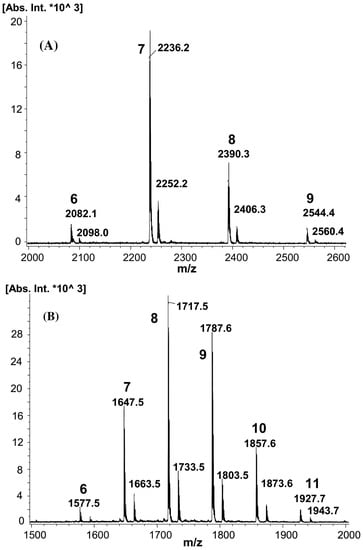 MALDI-MS spectra of β-CD decanoate esters (A) and β-CD butyrate esters (B). Masses of sodium adducts (first series) and potassium adducts (second series) are shown with numbers indicating the degree of substitution (reprinted with permission from []).