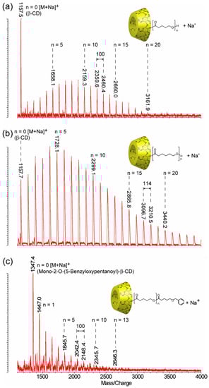 The mass spectra of ECD: (a) mono-2-O-poly(δ-VL)-β-CD (m/z = 1134 (β-CD) + n × 100 (δ-VL) + 23 (Na+)), (b) mono-2-O-poly(ε-CL)-β-CD (m/z = 1134 (β-CD) + n × 114 (ε-CL) + 23 (Na+)), and (c) mono-2-O-(5-benzyloxypentanoyl)-poly(δ-VL)-β-CD (m/z = 1324 (mono-2-O-(6-benzoxy-pentanoyl)-β-CD) + n × 100 (δ-VL) + 23 (Na+)) (reprinted with permission from []).