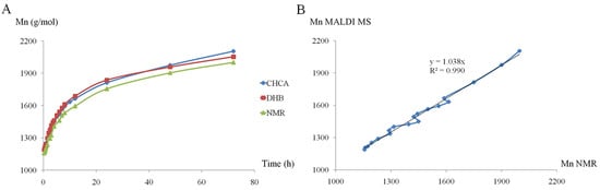 Mn (number-average molecular mass) evolution of β-CDLA product determined by 1H NMR and MALDI MS (DHB—dried droplet, CHCA—thin-layer) (A) and the agreement between the Mn evolution determined by 1H NMR and CHCA (B) (reprinted with permission from []).