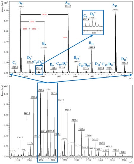 - Harvey, D.J. Analysis of carbohydrates and glycoconjugates by matrix-assisted laser desorption/ionization mass spectrometry: An update for 2009–2010. Mass Spectrom. Rev. 2015, 34, 268–422. [Google Scholar] [CrossRef]