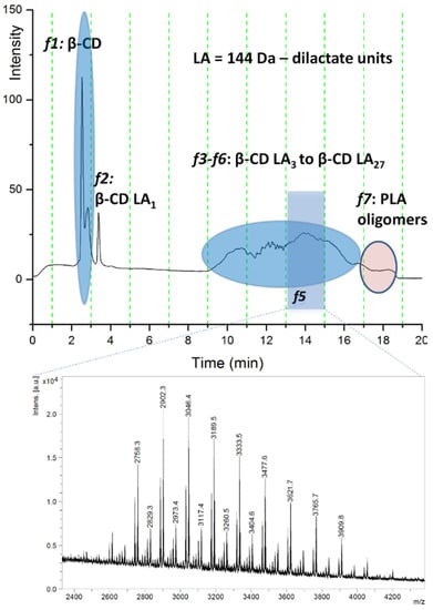 On the other hand, the quantification of the unreacted cyclodextrin content in these systems was directly correlated with their performance in the ring-opening process. Further experiments involved deeper characterization through HPLC chromatographic separation (reversed-phase gradient elution separation on a silica-C18 column) with online ELSD detection and offline MALDI MS analysis. The eluted compounds were separated according to the increasing number of lactate monomer units attached to the β-CD. Thus, the chromatogram exemplified in Figure 7 describes the relative content of reacted β-CDLA and native β-CD in the β-CDLA reaction mixture, as measured by ELSD detection, in parallel with MALDI-TOF MS chromatographic peak identification (TOF/TOF mass analyzer).