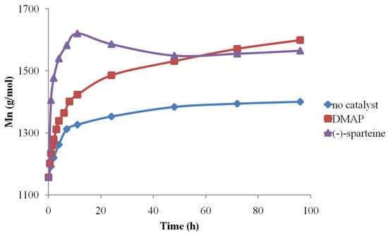 After establishing the MALDI-TOF MS analysis conditions, the method was further used to determine the organo-activator influence in both solvents. Therefore, the MALDI MS data concerning the Mn evolution revealed that (-)-sparteine systems are the most active, followed by DMAP and finally by pure solvents (Figure 9).