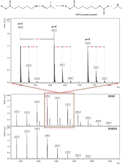 Depolymerization reactions also occurred in the presence of (-)-sparteine, signaled by the observed decreases in Mn values. Depolymerization reactions also led to higher molecular mass dispersity of the samples, as determined by MS, while the use of DMAP organo-activator led to lower dispersity values, even at longer reaction times. Moreover, the results obtained by MALDI-TOF MS showed that DMF systems are more active than DMSO because of solvent degradation during the reaction, which leads to dimethylamine formation and also to the attachment of formate moieties to CDCL derivatives, detected as MS peaks upshifted with 28 Da from the main series (Figure 10—MS spectra and the formation of secondary products). The amine secondary product is acting as an additional organo-activator, thus explaining the higher polymerization rates observed for DMF solvent.