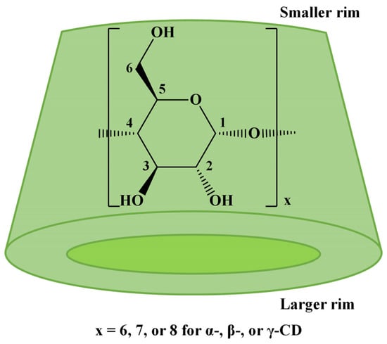 Due to their particular shape, CDs have a hydrophilic outer surface and a hydrophobic inner cavity that can accommodate other hydrophobic molecules through physical interactions. The inclusion phenomena have received special attention regarding enzyme mimetics [], for example, the phenyl ester hydrolysis as a model of chymotrypsin activity [] or activity in the ring-opening oligomerization (ROO) of cyclic esters [].