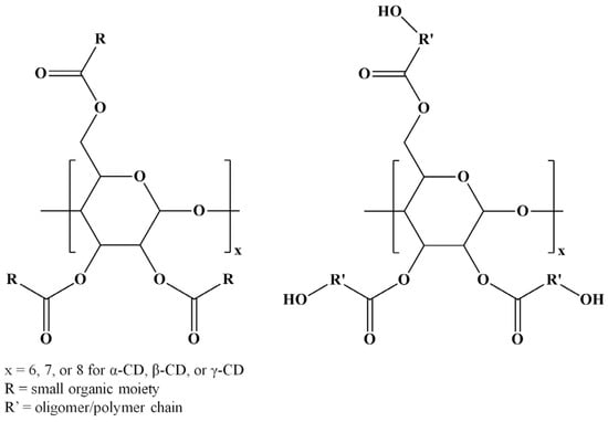 Among various strategies for CD chemical modification, there may be distinguished the enzyme-catalyzed transesterification reactions that lead to selective CD substitutions through ester bonds (ECD) []. However, several esterification reactions for CD molecules are available using various compounds, such as carboxylic acids [,], acyl chlorides [,,,,,,,,], anhydrides [,,,,,,,,,,,], esters [,,,,,,,,,,,], lactones [,,,,,,,,,], and lactides [,,,,,,]. Although regioselectivity is not always achieved in such chemical modifications, the changes in the CDs’ physicochemical properties following the derivatization procedure make the ECD derivatives attractive for various applications. Furthermore, CD molecules can be grafted with oligoester or polyester chains resulting in star-oligomer or star-polymer architectures having the CD molecule as a core. Scheme 2 presents the general structures of ECDs resulting from modification with one molecule per substitution site, or more similar molecules per substitution site, as in the case of CD-oligoesters (OECD).