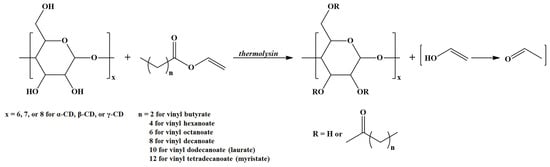 A distinct class of amphiphilic ECD with potential applications for self-assembly nanostructures may be prepared via Thermolysin (a thermostable extracellular metalloendopeptidase from Bacillus thermoproteolyticus)-catalyzed transesterification of vinyl esters of fatty acids in the presence of CDs (Scheme 3) []. In principle, such compounds require a pinpoint calculation of the SD together with the determination of the substitution site.