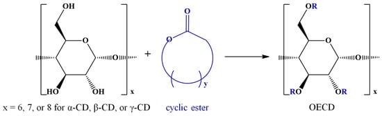 Cyclodextrins’ ability to form inclusion complexes with various guest molecules has been exploited for regioselective substitutions, as reviewed []. Moreover, the transesterification reaction of vinyl esters and nitrophenyl esters, in the presence of cyclodextrins, leads to selectively substituted ECD []. The selectivity of the substitution is triggered by the inclusion of the reactive species in the cyclodextrin cavity. This interesting feature related to the CD inclusion effects has been further explored by conducting ROP of cyclic esters in the presence of CDs, leading to oligoester-modified cyclodextrins (OECDs), as shown in Scheme 4. The influence of CD in such reactions was proved in the pioneering work of Harada, who showed that indeed, cyclic esters undergo transesterification reactions with CD hydroxyl groups []. The exact mechanism by which cyclodextrins influence such reactions is yet to be established, but the involvement of physical inclusion processes of cyclic esters into the CD cavity was unequivocally proved [].