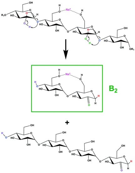 Another recent study concerning the fragmentation of sodium-charged β-CD employed a homebuilt high-resolution ion mobility mass spectrometer with cryogenic infrared action spectroscopy to obtain FTIR cryogenic spectra of specific fragment ions resulting from CID fragmentation []. Simulation studies associated with the cryogenic FTIR data, regarding the main sodium-charged fragments, allowed the structural identification of the corresponding structures. Their results indicated that one type of structure is energetically favorable to be formed during β-CD fragmentation, the 2-ketone-type structure, as shown in Scheme 6. The experiments and simulation studies also revealed that in the gas phase, only one sodium-charged conformer is stable for fragments with 2, 3, 4, and 5 glycoside units, while for the fragment corresponding to 6 glycoside units, more than one stable conformer can be formed.
