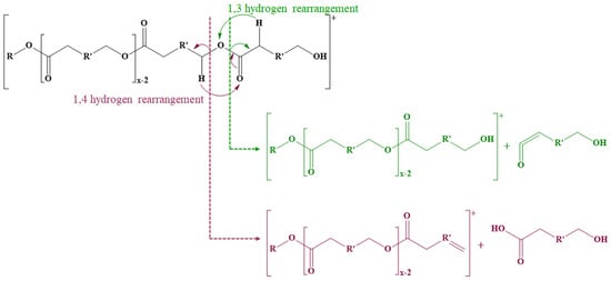 The fragmentation of ECD also needs to consider the general fragmentation pathways characteristic of polyesters. Thus, the cleavage of ester bonds leads to three main fragmentation pathways (Scheme 7) [,,,]. The first mechanism involves the cleavage of ester bonds through 1,4-hydrogen (McLafferty) rearrangements when the 1,4-hydrogen is transferred to the oxygen from the carbonyl group leading to the formation of two compounds, one with a carboxyl end group and one with an unsaturated end chain. The second fragmentation mechanism takes place through 1,3-hydrogen rearrangements when hydrogen from the methylene group from the α-position is transferred to the ether oxygen of the ester bond, leading to the formation of a compound with an unsaturated carbonyl end group (a carboxylic acid group without a water molecule) and an alcohol. Intramolecular transesterification reactions may also occur, similar to backbiting processes; an alcohol end group is required for this mechanism. The oxygen from the hydroxyl group at the end of the polyester chain performs a nucleophilic attack on carbon from the ester carbonyl group, leading to the formation of a macrocyclic ester and an alcohol.