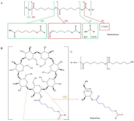 Native CDs, their derivatives, and inclusion complexes are structurally diverse, and mass spectrometry represents a powerful tool for the elucidation of their chemical structure. Although many studies employed mass spectrometry techniques for the characterization of CD-based compounds, only a few studies used tandem mass spectrometry to perform structural identification based on fragmentation patterns [,,,,,,,,,,,]. The fragmentation patterns of CD-based structures can be influenced by the structure of the monomer units (substituted and unsubstituted glycoside units), the nature of the substituent groups (small molecules or polymeric chains), the binding affinity towards certain (metal) ions, and the presence of guest molecules physically included in the CD cavity []. ECDs may be assimilated as block oligomers that undergo fragmentation pathways related to the cleavage of chemical bonds situated in the oligosaccharide block or to the cleavage of attached moieties through ester bonds [,,].