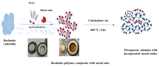 Schematic representation of the synthesis of γ-alumina with incorporated metal oxides is presented in Figure 1, while the notation of the samples studied with basic information is provided in Table 1.