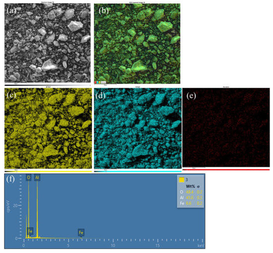 EDX spectrum and elemental mapping for Al-Fe10-3: (a) SEM image, (b) layered elemental mapping, (c) aluminum distribution, (d) oxygen distribution, (e) iron distribution, and (f) the corresponding EDX spectrum.