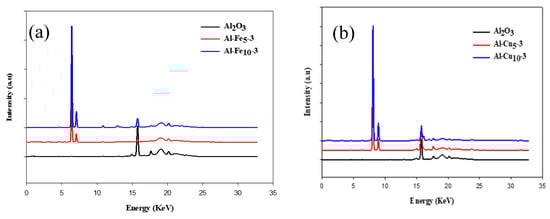 To discover the composition of the obtained materials, an X-ray fluorescence analysis was carried out. The XRF spectra of the samples studied in comparison to the spectrum of pristine Al2O3 are shown in Figure 4.