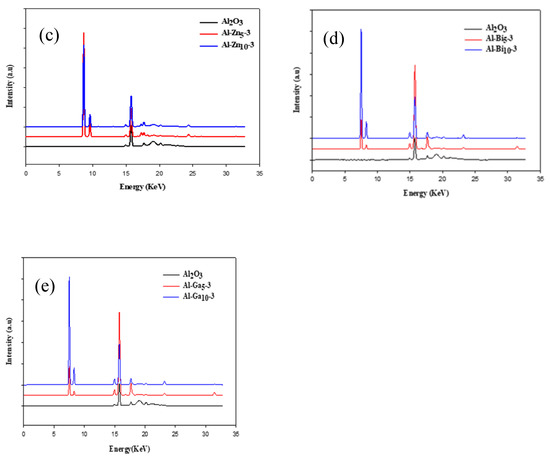 The XRF spectra of Al2O3 and γ-Al2O3 samples incorporated with selected metal oxides species: Fe (a), Cu (b), Zn (c), Bi (d) and Ga (e).
