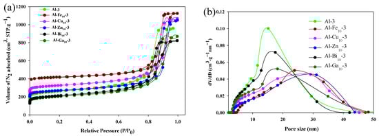 N2 adsorption/desorption isotherms for various samples (a) with the corresponding pore-size distribution curves (b) (obtained from the adsorption branches). For clarity, the isotherms for Al2O3-3, Al-Fe10-3, Al-Cu10-3, Al-Zn10-3, Al-Bi10-3, Al-Ga10-3 in (a) are offset along the y-axis by 175, 350, 250, 200, 225, and 125 cm3·g−1, respectively.