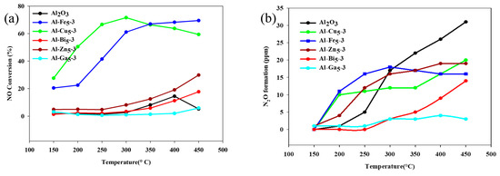In the case of all tested samples, besides pristine Al2O3 and gallium oxide-incorporated samples, an increase in the reaction temperature accelerates the NO conversion as shown in Figure 6a. In the case of alumina, after exceeding the temperature of 450 °C, nitrogen oxides are produced rather than NO conversion. This phenomenon is not observed for the metal oxide-incorporated alumina samples. Among all metal oxides used, the copper and iron oxide-incorporated samples showed a significant improvement in the catalytic behavior of alumina. The Al-Cu5-3 material reveals the best catalytic properties for the low-temperature SCR, reaching 71% NO reduction at 300 °C. Overall, the highest NO conversion rate was observed for Al-Fe5-3 material, reaching a 70% reduction at the temperature of 450 °C. Incorporation of zinc intoAl2O3 structure caused increased catalytic performance of the material with increasing temperature, but this change is so small, that it is below profitability. Modification of Al2O3 with bismuth in principle did not affect the catalytic properties of alumina at all and the incorporation of gallium oxide even reduced them.