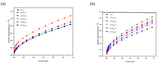 CO2 adsorption isotherms measured at 25 °C for pristine alumina and metal oxide-incorporated samples: Al-MeO5-3 series (a) and Al-MeO10-3 series (b).