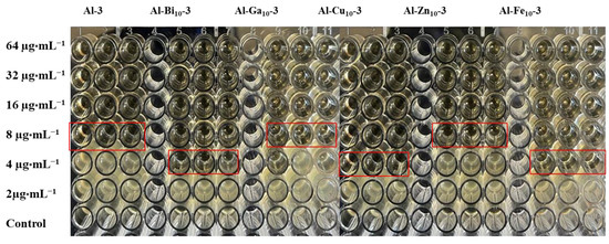 Photographs showing the MIC measurements for Al2O3, Al-Cu10-3, Al-Zn10-3, Al-Fe10-3, Al-Bi10-3, and Al-Ga10-3 (MIC values are marked in the red box) against Pseudomonas aeruginosa.
