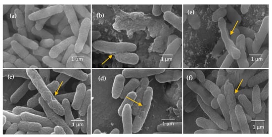 SEM images showing the status of cell morphology and membrane integrity of the bacterial cells treated with Al2O3 (a), Al-Zn10-3 (b), Al-Fe10-3 (c), Al-Cu10-3 (d), Al-Ga10-3 (e) and Al-Bi10-3 (f) (yellow arrows show the cell membrane ruptures).