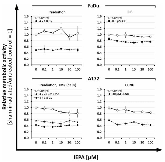 Tumor cells were allowed to adhere 24 h prior to treatment. If not otherwise noted, IEPA was applied 1 h prior to treatment with cytostatic agents or irradiation. Based on the clinical practice, chemotherapeutic agents TMZ (single or fractionated treatment) and CCNU (single treatment) were applied to glioblastoma (A172) and CIS (single treatment) to head and neck cancer (FaDu) cells. IR (single-dose or fractionated) was conducted immediately after drug application. If not otherwise noted, fractionation (TMZ and IR) was performed daily for 4 consecutive days with medium renewal before IEPA administration. The concentrations of cytostatic agents and IR doses in combination experiments were adapted from preliminary metabolic activity measurements in tumor cells (Figure 1) and correspond to the respective half-maximal inhibitory doses/concentrations (ID50/IC50) or multiples of these (Table 1).