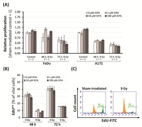 Tumor cells showed a time-dependent reduction in proliferation activity to 65.1 ± 11.8% (FaDu) and to 41.8 ± 8.3% (A172) at 72 h after IR (n = 2, p ≤ 0.05 in FaDu; p ≤ 0.001 in A172; Figure 2A). IEPA alone increased the proliferation only slightly in A172 cells, to 116.3 ± 4.3% (10 µM) and 118.5 ± 4.6% (100 µM) 72 h after treatment (n = 2, p ≤ 0.01). IEPA given 1 h prior to IR had no effect on IR-induced proliferation decline, though a tendency for an additional dose-dependent reduction was seen in both tumor cell lines.