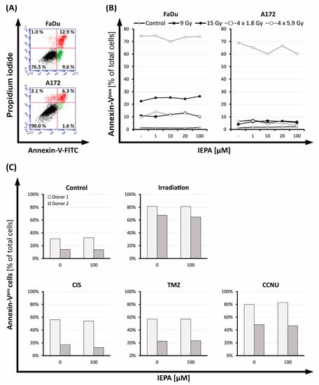 (A) Flow-cytometric dot plot of FaDu and A172 cells 72 h after IR (15 Gy), partitioned into vital cells (Annexin-Vneg PIneg, lower left quadrant), apoptotic cells (early apoptotic: Annexin-Vpos PIneg, lower right quadrant; late apoptotic: Annexin-Vpos PIpos, upper right quadrant), and necrotic cells (Annexin-Vneg PIpos, upper left quadrant). (B) Fraction of apoptotic cells (Annexin-Vpos) in FaDu and A172 cells 72 h after IR in various regimens (single-dose: 9, 15 Gy; fractionated: 4 × 1.8, 4 × 5.9 Gy); treatment with IEPA compared with representative untreated control (sham-RT). (C) Fraction of apoptotic cells (Annexin-Vpos) in CD34+ HSPCs 72 h after IR (3.2 Gy, single-dose), treatment with CIS (1 µM), TMZ (40 µM), or CCNU (60 µM), and application of IEPA (100 µM) compared with sham treatment.